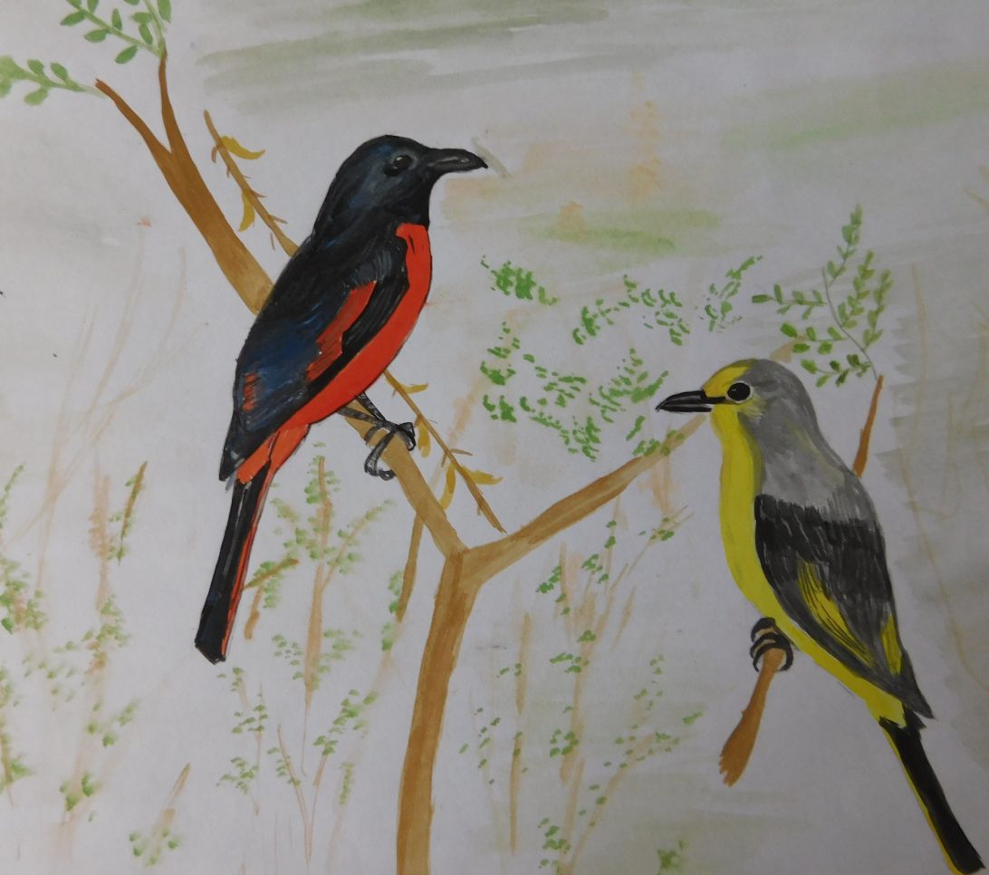 Pair of grey wagtail birds seen near cattle dung- water colour painting
