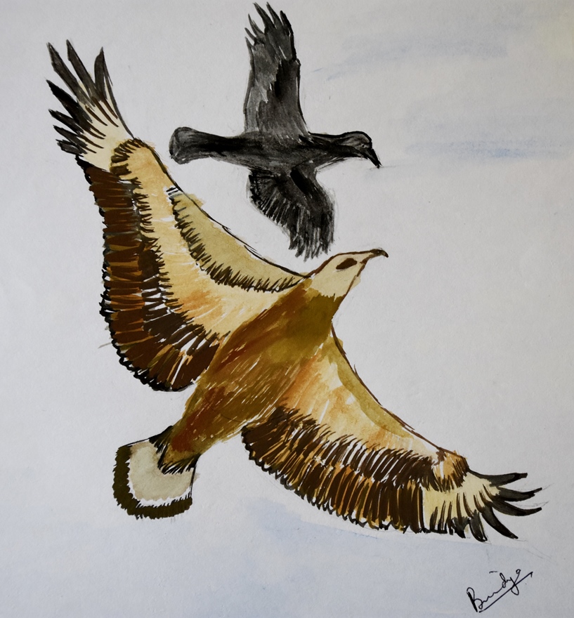 Jungle Crow relentlessly harry birds of prey, mobbing and aggravating both incubating birds on the nest and any low flying large raptors which is persistently chased. ………It will steal food from vulture nest sites, even from under the protesting gaze of the parent vulture which has regurgitated food for its chicks. 5