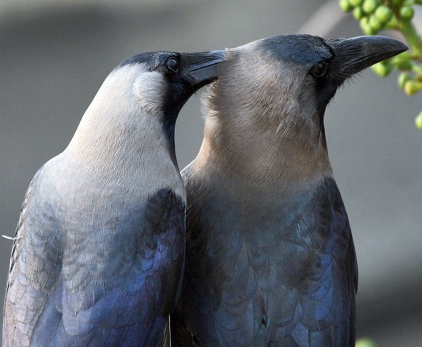 SOCIAL LIFE -Like most birds, corvids are monogamous, and the core unit is therefore the mated pair. This pair bond is typically for life, and the pair remains together throughout the year. For example, rooks and ravens find a partner during the autumn months, taking part in impressive aerobatic displays and food sharing which may be to assess the quality of a potential mate. Once juvenile rooks and ravens pair, they engage in extensive mutual preening and bill twining (bill holding) and support one another in fights. 21