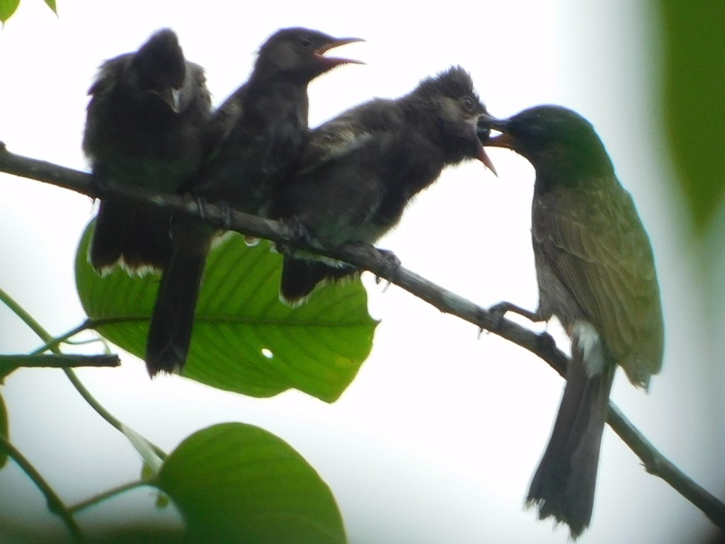 Young Ones fed by Parent Red Whiskered Bulbul after rains out of their nest