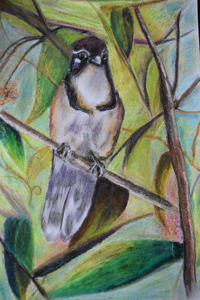 By late morning I happened to spot one of them alighted for a siesta on a branch . With more details of the bird, such as white supercilium above the eyes, black eye ring …. coming into light, I was able to recognize the bird then and take snaps. My reference book for birds suggested the name Lesser Necklaced laughing thrush. ‘Laughing’? In retrospect, I recalled the cacophony of chuckling sounds I heard previously. Subsequently, I drew the bird on a paper with oil pastel.
