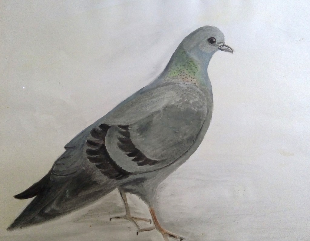 We can see rock pigeons in villages and towns comfortable with human presence, feeding on insects and grains. Their grey body with black bars across wings, green and pink iridescence on neck are alluring. They feed usually in flocks and roost on roof tops or window shades. It’s entertaining to watch them bobbing heads, preening feathers and gathering twigs during nesting season. Their deep cutrr-coo calls and sounds of their flapping wings are one amid varied sounds that urban dwellers hear all day except that birds sounds are calming to our senses.