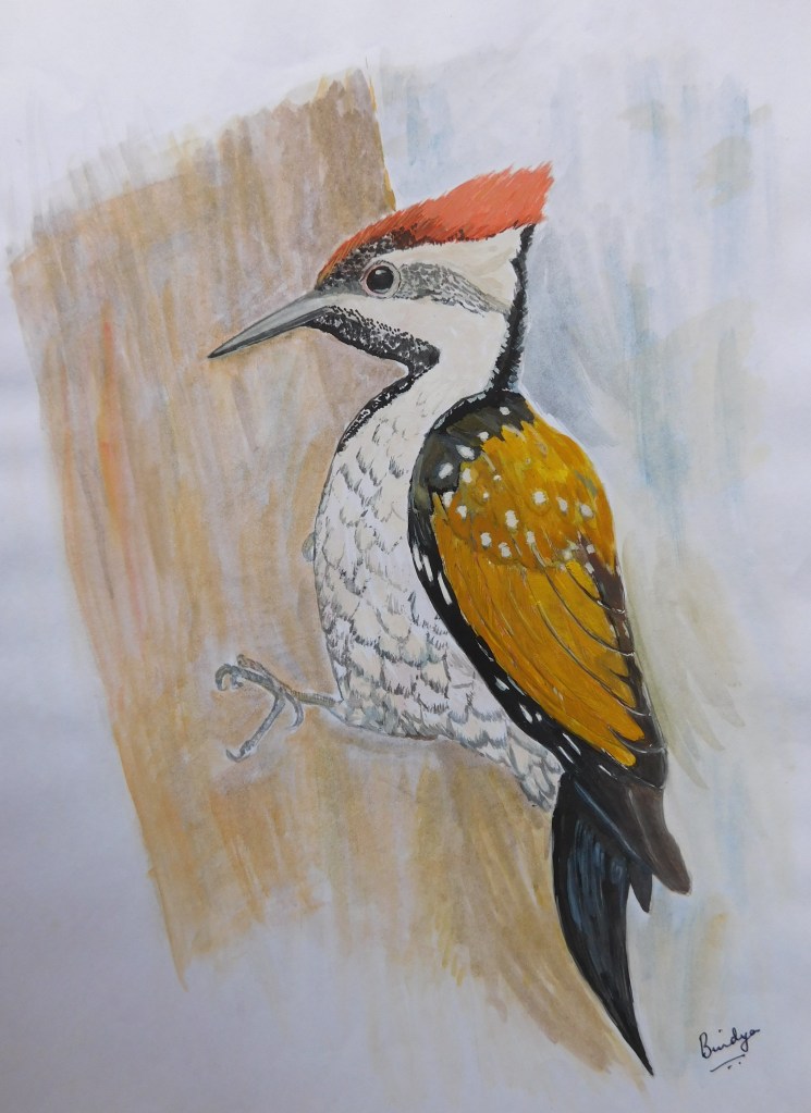 A loud whinning call by the black rumped flame backed woodpecker interrupted the calm of the woods in urban area, actively tapping(drumming) on the tree trunks, moving from one branch to another and from one tree to another and as the name suggests looked like a flash of flame amidst the woods.