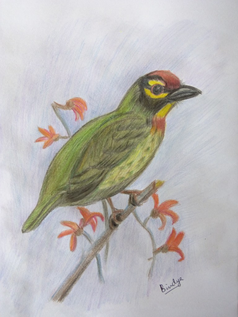I saw the cover page picture of the book Birds of the Indian Subcontinent by Richard Grimmet, Carol Inskipp, Tim Inskipp and got impressed by the art work by John Cox. I tried doing a pencil sketch of Coppersmith Barbet a frugivorous bird found in wooded areas. I know that the quality of the picture is nowhere near that of the original picture or the magnificient beauty of the bird in real.